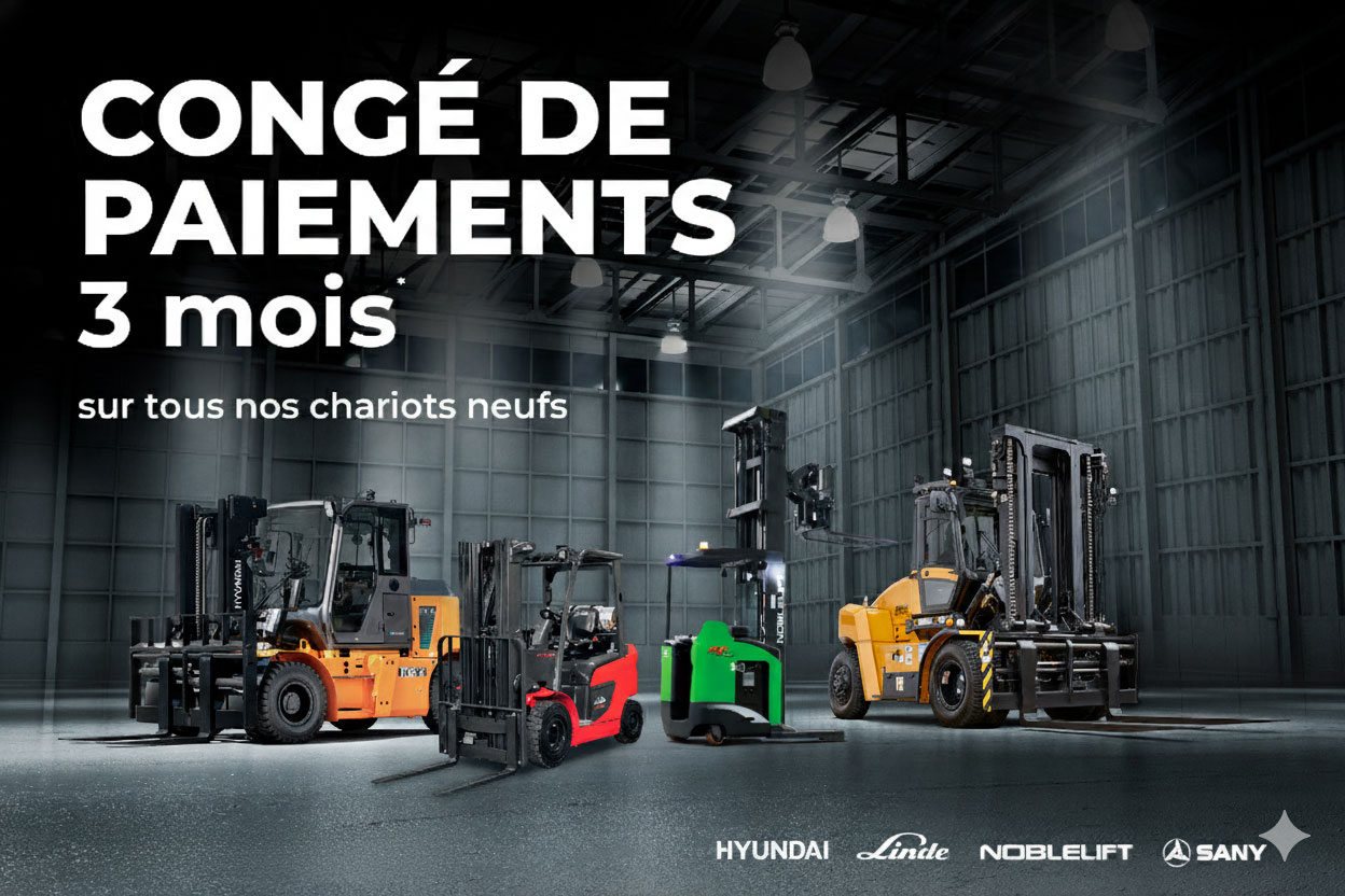 *Offre valide du 1er janvier au 31 mars 2026 (inclusivement), sous réserve de modification sans préavis. Applicable sur les équipements de manutention neufs (toutes marques offertes : Hyundai, Linde, NobleLift et Sany), selon disponibilité. Le congé de paiements de 3 mois est offert uniquement dans le cadre d’un financement par voie de crédit-bail de 48 ou 60 mois et demeure conditionnel à l’approbation de crédit par l’une de nos institutions financières partenaires.
